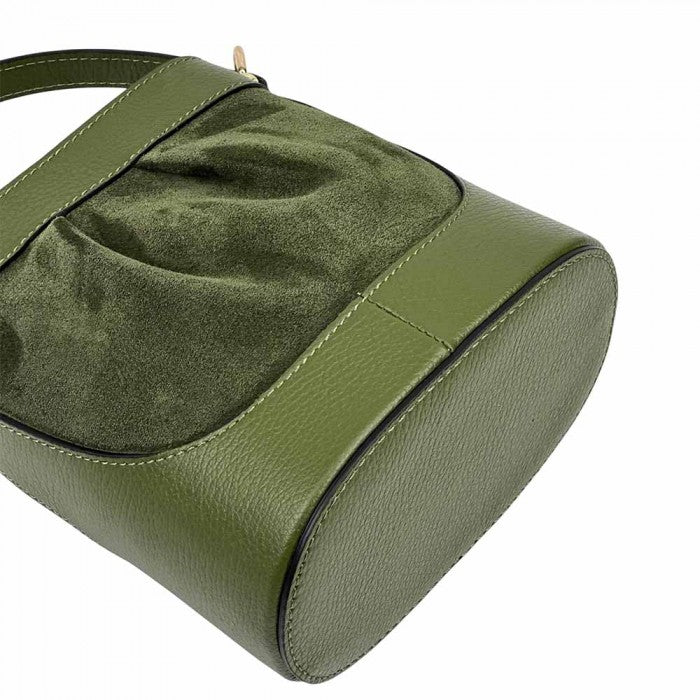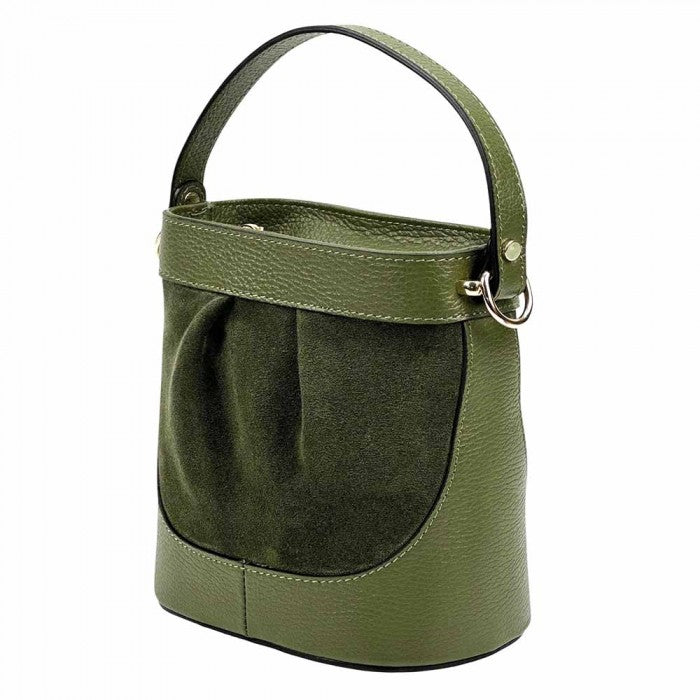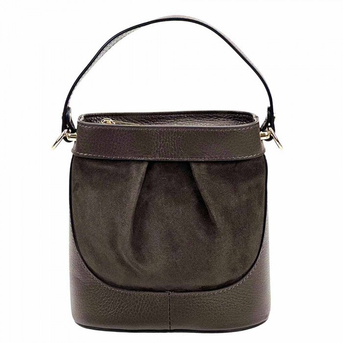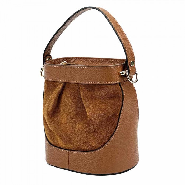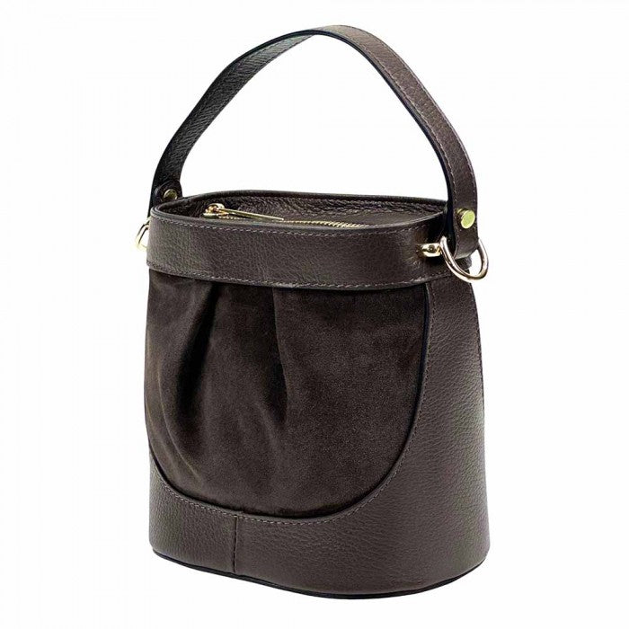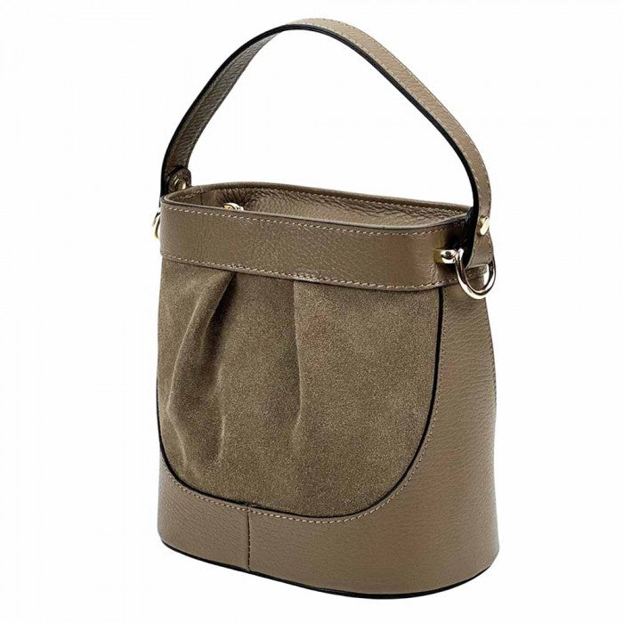 Chic, compact, and artfully designed, Reena blends soft Italian suede with smooth full-grain pebbled leather, creating a refined contrast that elevates its sleek cylindrical silhouette. This small yet structured bucket bag features a sturdy leather top handle for an elegant handheld look, while the detachable strap offers added versatility. Lightweight and beautifully balanced, Reena is the perfect size for daily essentials without feeling bulky.