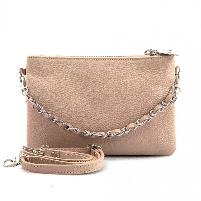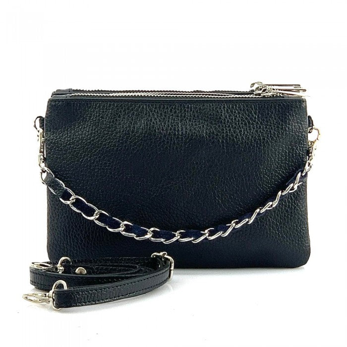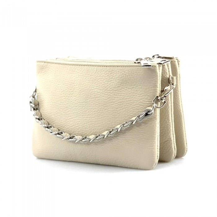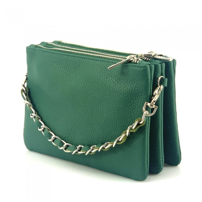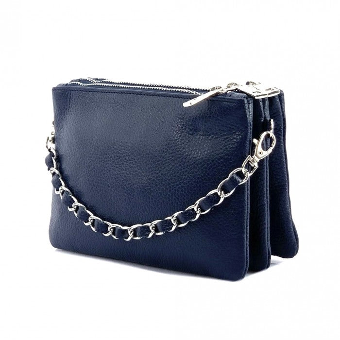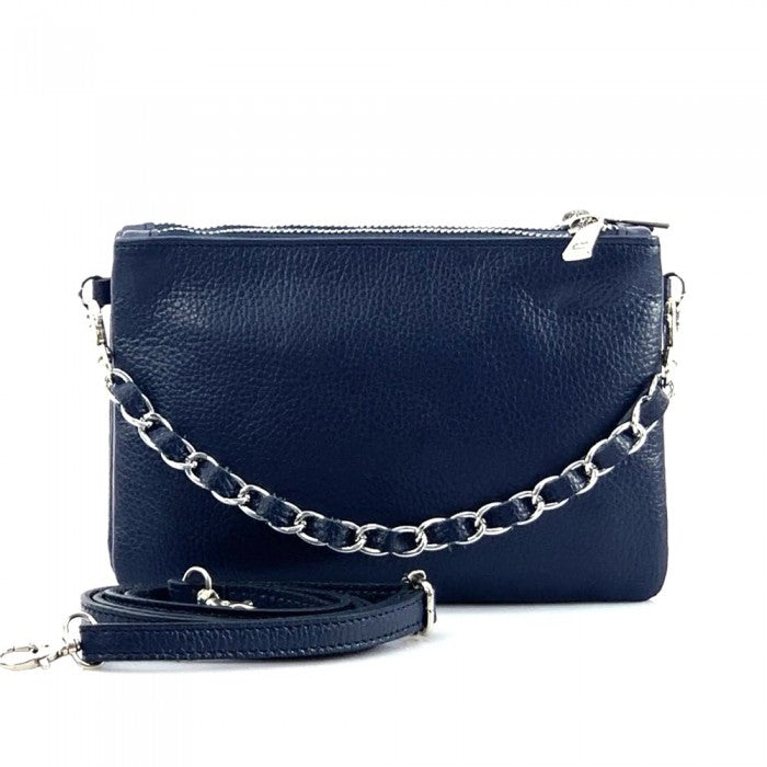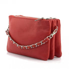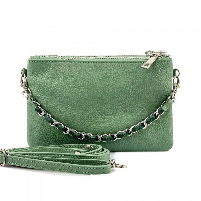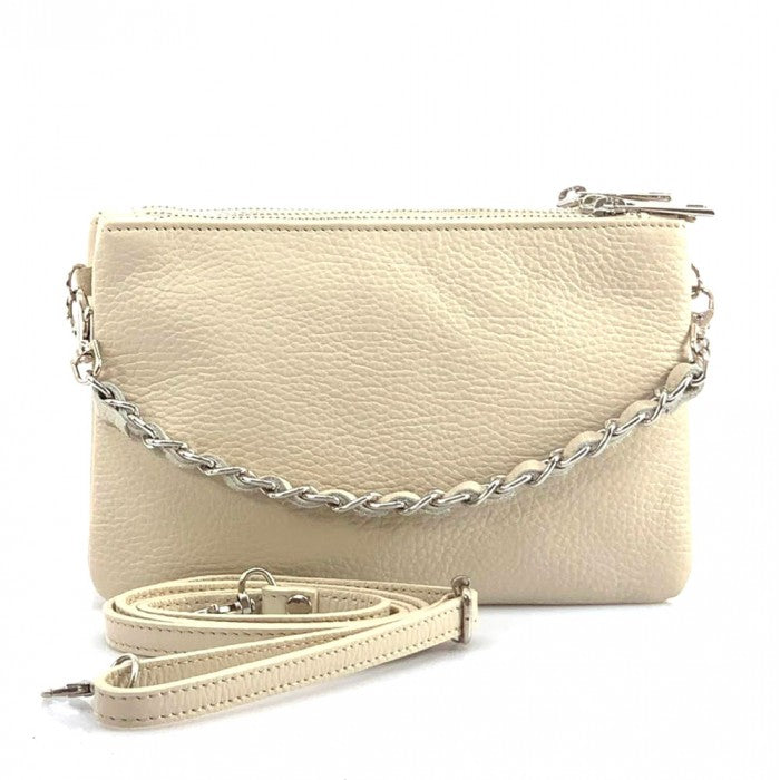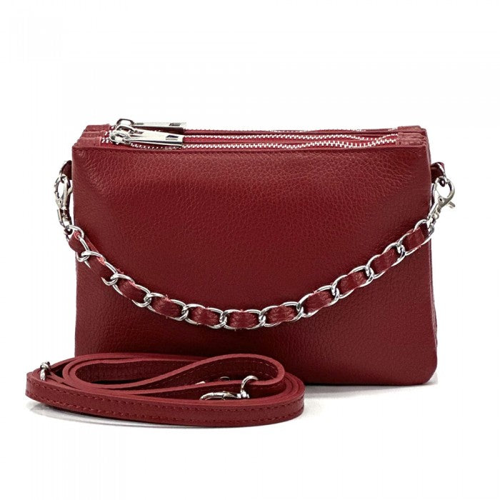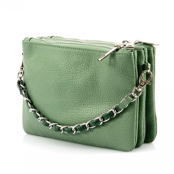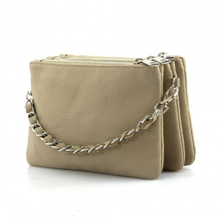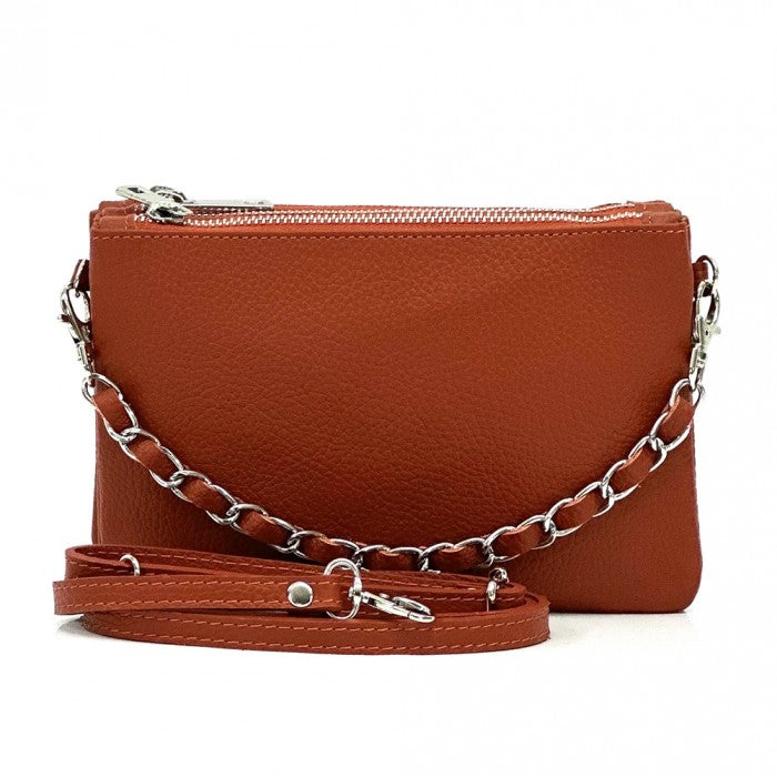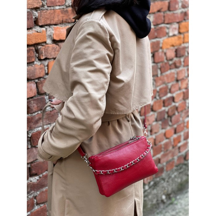 The cotton-lined interior features three organized compartments with secure zip closures, offering room for your phone, wallet, keys, and small essentials. A removable, adjustable slim leather strap allows you to wear it comfortably as a crossbody or shoulder bag, while the chain detail adds a fashionable edge when carried as a clutch. Available in Black, Blue, Brown, Red, Beige, Green, and more, Verona adapts effortlessly to both casual and refined looks.