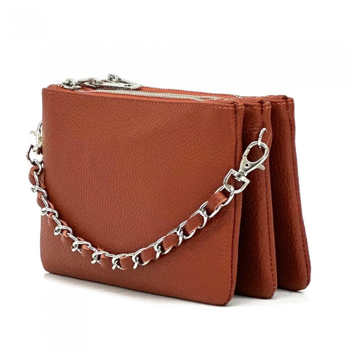 Sleek, soft, and effortlessly versatile, Verona is crafted from full-grain Italian leather with a refined pebbled finish that adds subtle texture and luxury. Its polished gold-tone metal chain accent brings a chic contemporary touch to the minimalist silhouette, making it the perfect accessory for outings, workdays, travel, or evening plans. Lightweight and compact, Verona delivers style without sacrificing practicality.