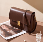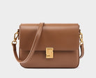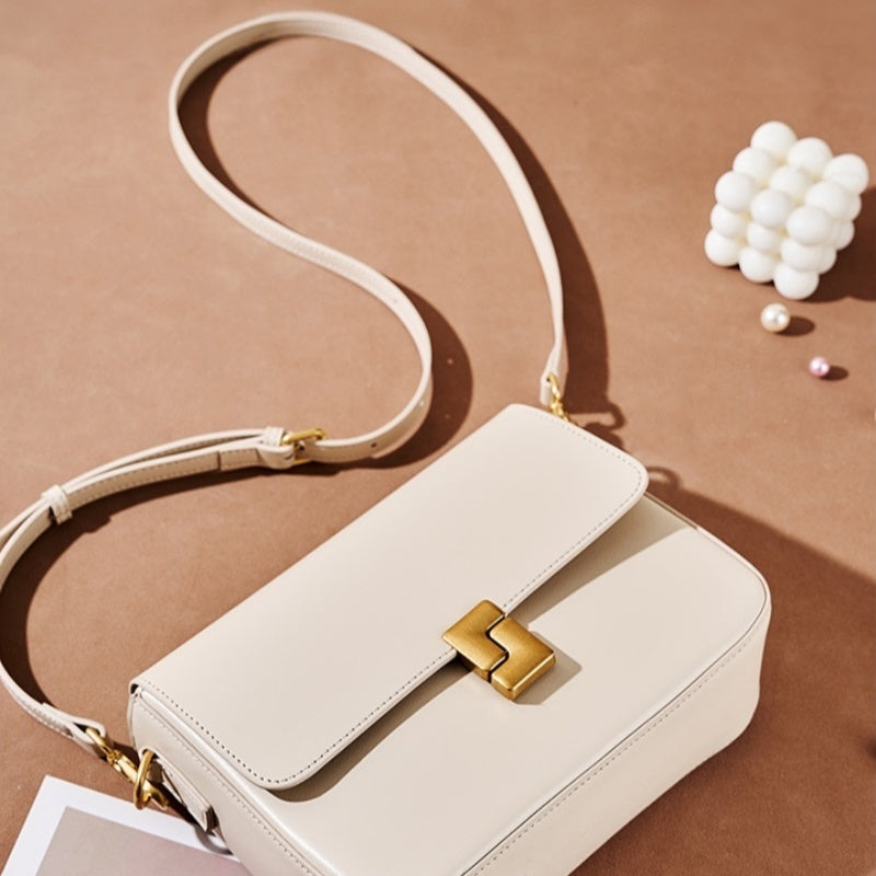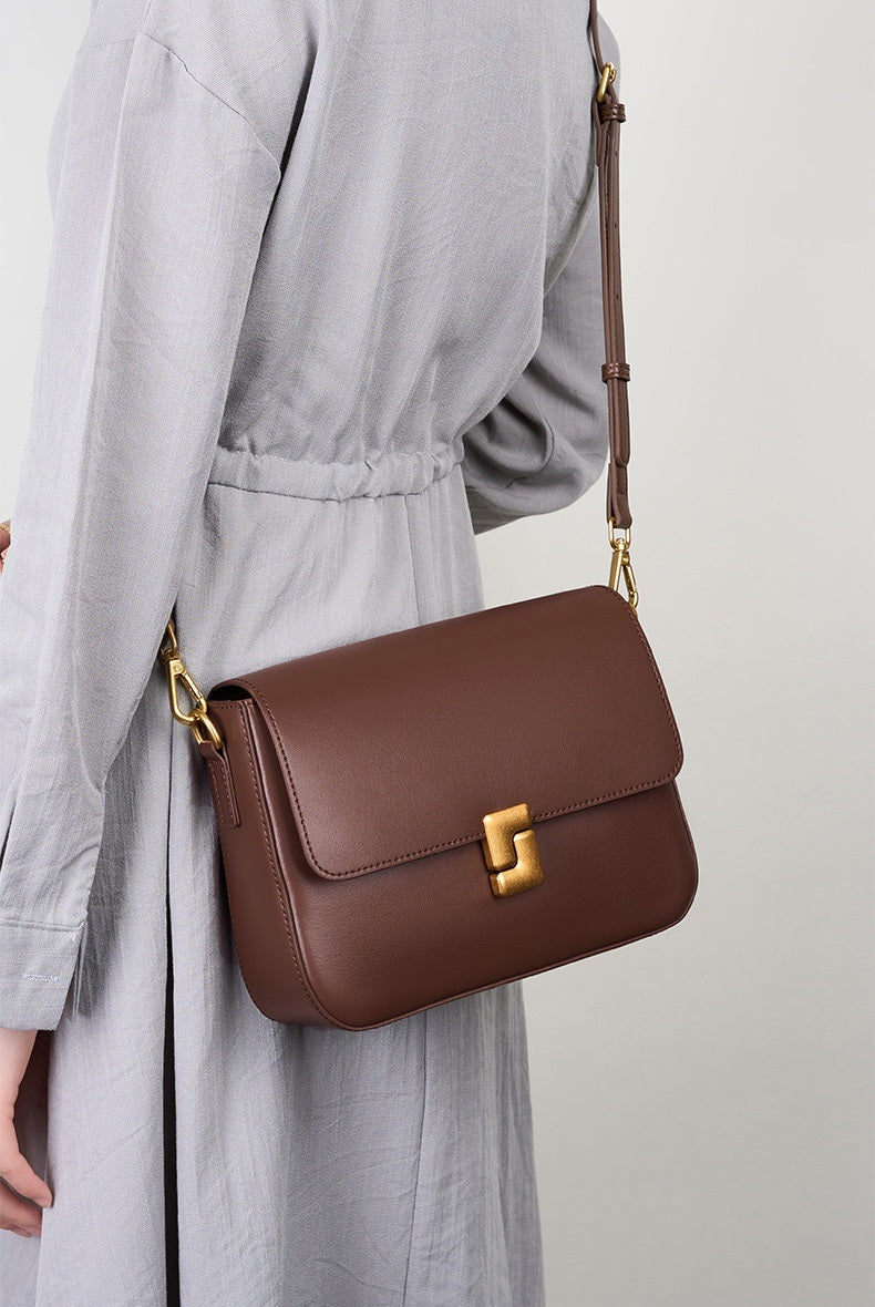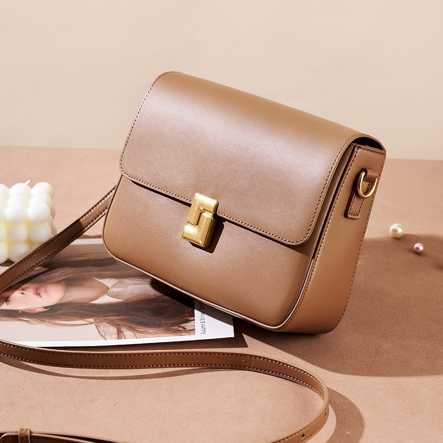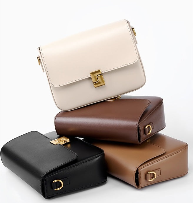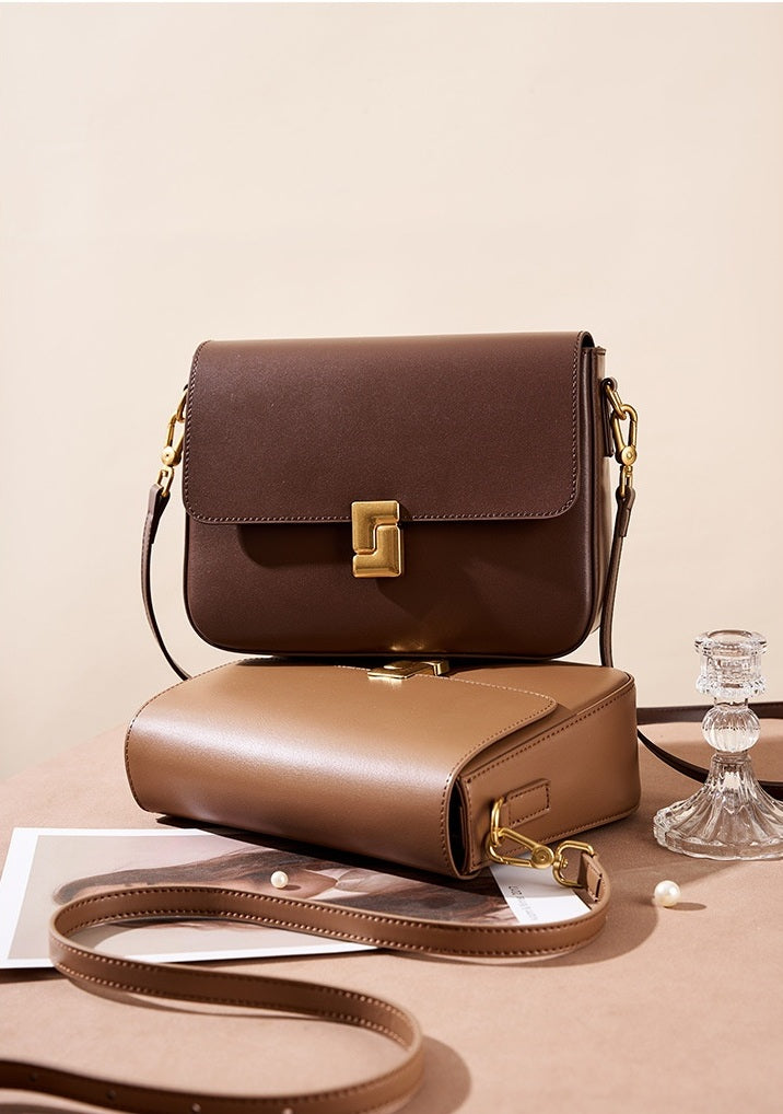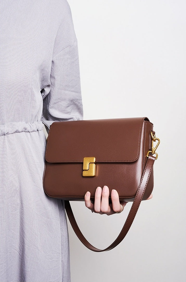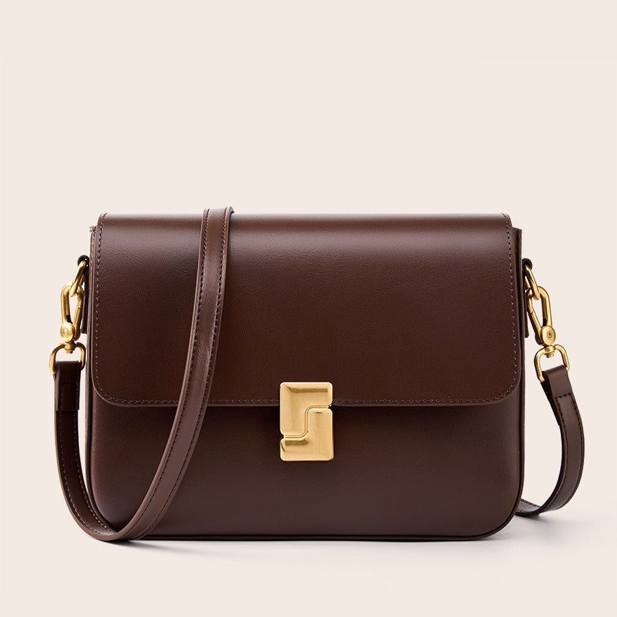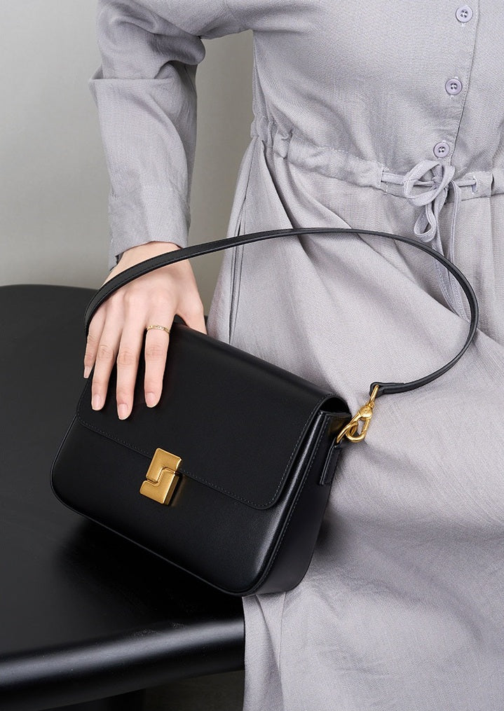 Mila is sleek sophistication in a structured square silhouette. Crafted from premium smooth genuine leather and finished with polished gold-tone hardware, she’s defined by her distinctive closure design that adds a bold, modern edge.